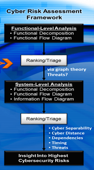 A functional level analysis is accomplished through functional decomposition and functional flow diagrams. The functional decomposition is continued to the level of supporting systems, using methods such as those in Fault Tree Analysis (FTA). Then a ranking and triage process ensues leading to a system level analysis with functional decomposition, functional flow, and information flow diagrams. This helps determine which systems support the elements that remain after functional-level triage. Another ranking and triage process occurs using markers including cyber separability, cyber distance, dependencies and timing. In cyber separability two systems are cyber separable from one another if no single cyber vector of attack could simultaneously degrade the functionality of both systems. This ultimately leads to insight into the highest level of cybersecurity risks across both platforms and missions, enhanced with the addition of current intelligence reporting.