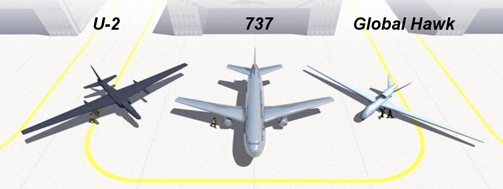 {5} “Our size diagram compares an RQ-4 Global Hawk with two well known aircraft, a U2 spy plane and a Boeing 737”. Image Credit: PWK International Advisers. December 5, 2015