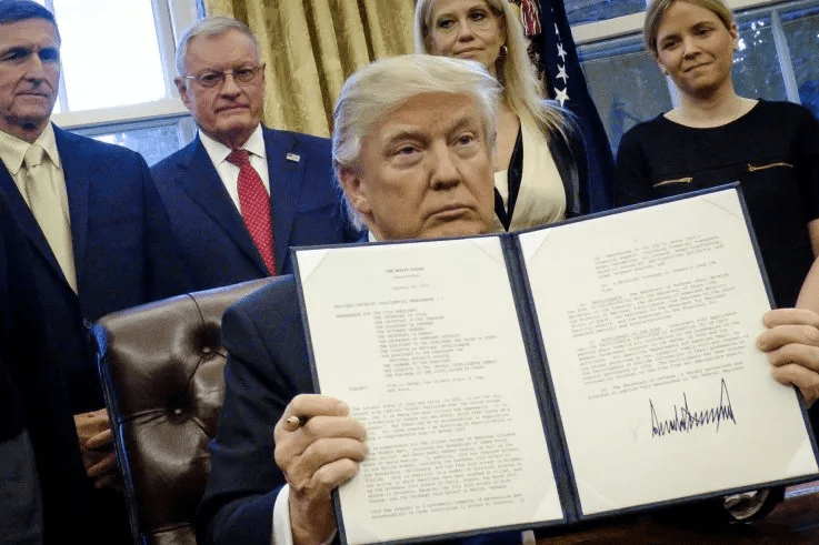 {2} President Donald Trump holds up an executive order he signed that demands each time a federal agency promulgates a new regulation, it must eliminate at least two old ones. Photo Credit: Pete Marovich/Getty