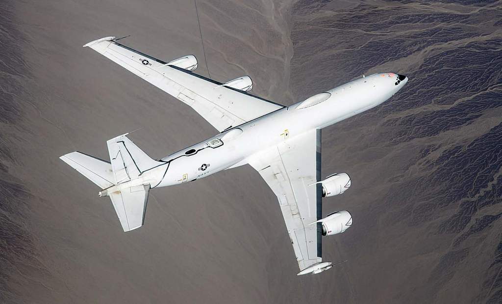{5d} Caption: A U.S. Navy E-6B Mercury command and control aircraft photographed during a testing sortie at Edwards AFB, California in early 2017. The airborne command post aircraft is equipped with satellite communication equipment to link the aircraft with the President and the other operational legs of the nuclear triad. Photo Credit: US Air Force.
