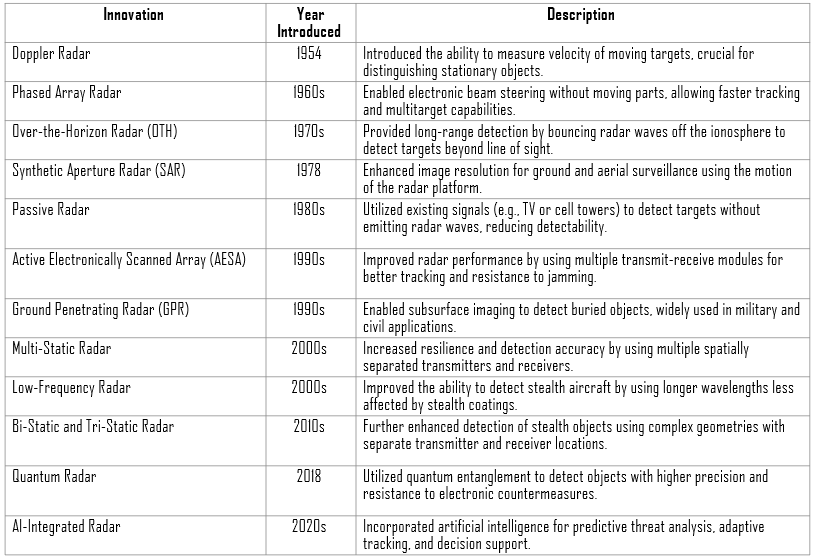 Stealth technology poses another challenge, as it reduces the detectability of aircraft and missiles. Innovations in radar, such as low-frequency and multi-static systems, are crucial for countering these threats. These advancements are complemented by sensor fusion and advanced signal processing techniques, enhancing detection capabilities.