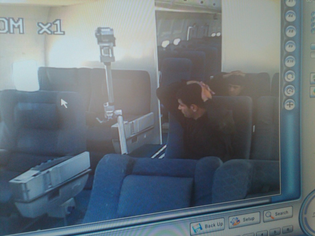 Radical Islamic airline hijackers place their hands on their heads in surrender as PackBot enters the first class cabin and uses a built in microphone and speaker to relay instructions. Image from CCTV feed.