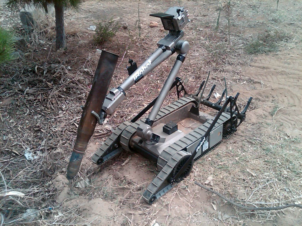 PackBot uses its dexterous manipulator to safely remove an unexploded Israeli rocket from a farm in the Beqaa Valley.