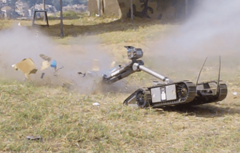 Packbot uses a water jet disruptor to render safe a briefcase containing home made explosives (HME).