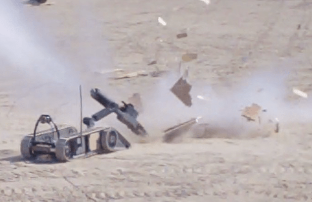 A package bomb is rendered safe by a small unmanned ground vehicle (SUGV) fitted with a 20mm water jet disruptor in a first of its kind demonstration.