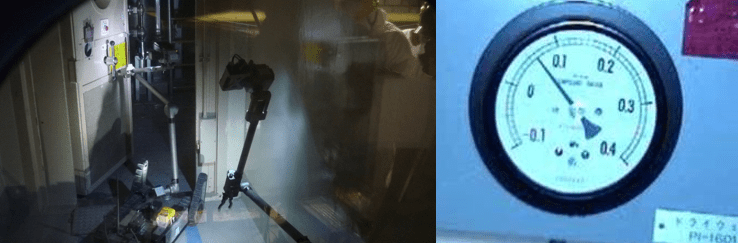 March 2011 Tokyo Electric and Power Company (TEPCO) Fukushima Daichi Nuclear Reactor Disaster | PackBot became the first robot to penetrate the crippled Fukushima Daiichi nuclear reactors in April 2011, remotely navigating into reactor buildings to open doors and gather critical readings on radioactivity, temperature, humidity, and oxygen levels data unobtainable by humans due to lethal radiation exposure. Image depicts the robot reading the analog pressure gauge of the primary containment vessel. (Images by Tokyo Electric and Power Company (TEPCO)).