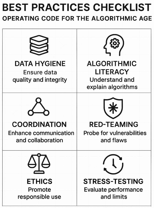 The third best practice is scenario red-teaming — wargaming complex, algorithm-driven crises such as flash crashes, misinformation floods, or cross-domain cyberattacks. These simulations convert theoretical vulnerabilities into operational awareness. Fourth, cross-sector coordination becomes essential. No agency, corporation, or nation can manage algorithmic risk in isolation. Shared intelligence networks and joint exercises between public and private sectors create the connective tissue of resilience.