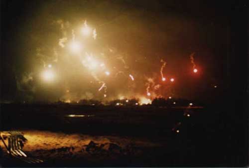 An NVA night attack is illuminated by star shell bursts.