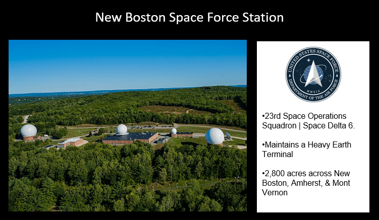 {4} The New Boston Space Force Station, located in New Hampshire serves as a pivotal node in the United States’ global space surveillance network. Established in 1959 as a radar tracking site and now operated by Space Delta 6 under U.S. Space Command, the base provides around-the-clock satellite control, telemetry, and data relay services that underpin modern military and intelligence operations. Its ground antennas maintain contact with Department of War and allied satellites, ensuring secure communication links and situational awareness across orbital domains. Once a Cold War outpost hidden in the forests of New England, New Boston has evolved into a digital command hub — quietly monitoring the heavens for threats, anomalies, and opportunities in the contested space domain.