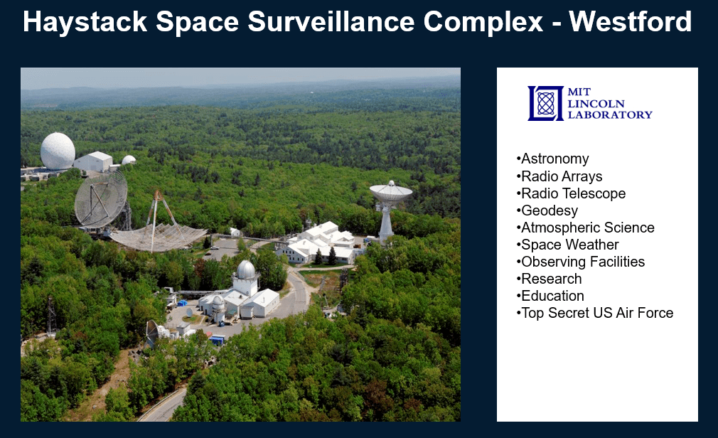 {3} The Westford Haystack Observatory, located northwest of Boston, is one of the most sophisticated radar and radio science facilities in the United States, operated by MIT under contract with the Department of War. Originally established during the Cold War for space surveillance and missile tracking, Haystack now supports national security missions including space domain awareness, deep-space imaging, and satellite characterization for the U.S. Space Force and Intelligence Community. Its massive, high-precision radar and 37-meter antenna array can detect and track objects tens of thousands of miles away, providing critical data on orbital debris, foreign satellites, and hypersonic vehicle testing. Quietly nestled in the Massachusetts countryside, Haystack remains a cornerstone of America’s strategic eyes in space — and an enduring symbol of how advanced research facilities underpin the nation’s defense infrastructure.