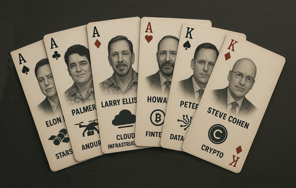 Fast-forward to the present, and the relationships between billionaires and the Department of War remains as robust as ever. Today’s defense landscape is defined by the convergence of private capital, advanced technology, and national security imperatives. Billionaires are not only financiers but also direct participants in shaping war‑fighting capabilities: Elon Musk’s SpaceX and Starlink underpin battlefield communications and missile defense architectures; Larry Ellison’s Oracle cloud forms the backbone of CJADC2 and JWCC; Peter Thiel and Alex Karp’s Palantir drive AI‑enabled targeting through Project Maven; and Palmer Luckey’s Anduril leads the charge in autonomous combat aircraft and drone swarms under the Replicator initiative.