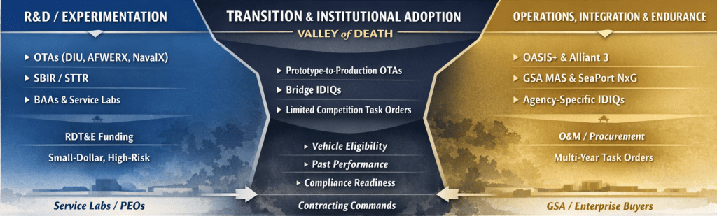 Over time, these signals harden into patterns. Vehicles designed for professional services and integration work tend to accumulate recurring task orders and long-term relationships, reinforcing incumbency and institutional memory. Vehicles positioned closer to research, experimentation, or rapid acquisition may appear more dynamic, but often lack clear transition paths into production or sustainment. The result is a bifurcated system in which innovation and execution are frequently separated by design, not accident—each governed by different vehicles, incentives, and success metrics.