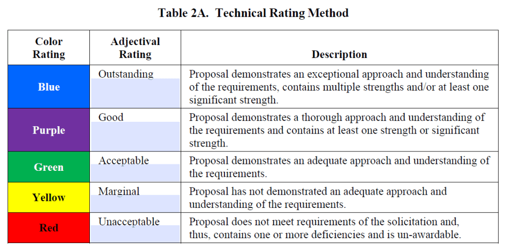 - Combined Ratings – A single color/adjectival rating that bakes risk into the technical assessment (e.g., “Purple/Good” means a thorough approach with low to moderate risk).
