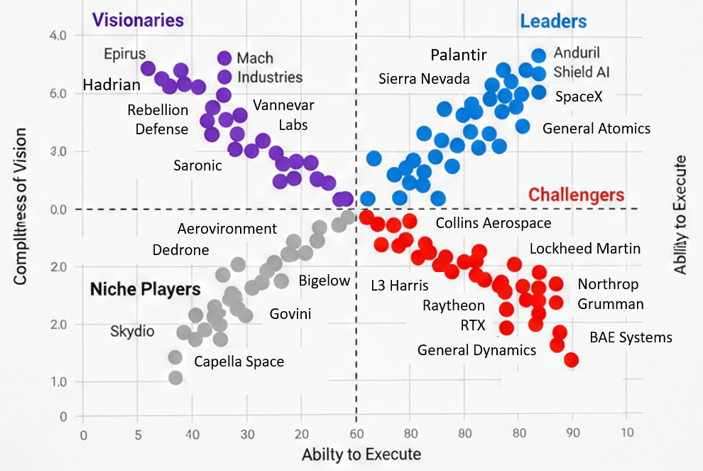 - Competitive Analysis of Emerging Tech Companies – defense startups and primes in AI, autonomy, cybersecurity, data centers, cislunar space and intelligence, surveillance and reconnaissance