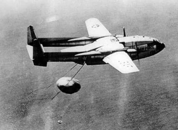 Caption: Discoverer XIV return capsule with silver halide film images is snared mid-air by US Air Force Pilots.